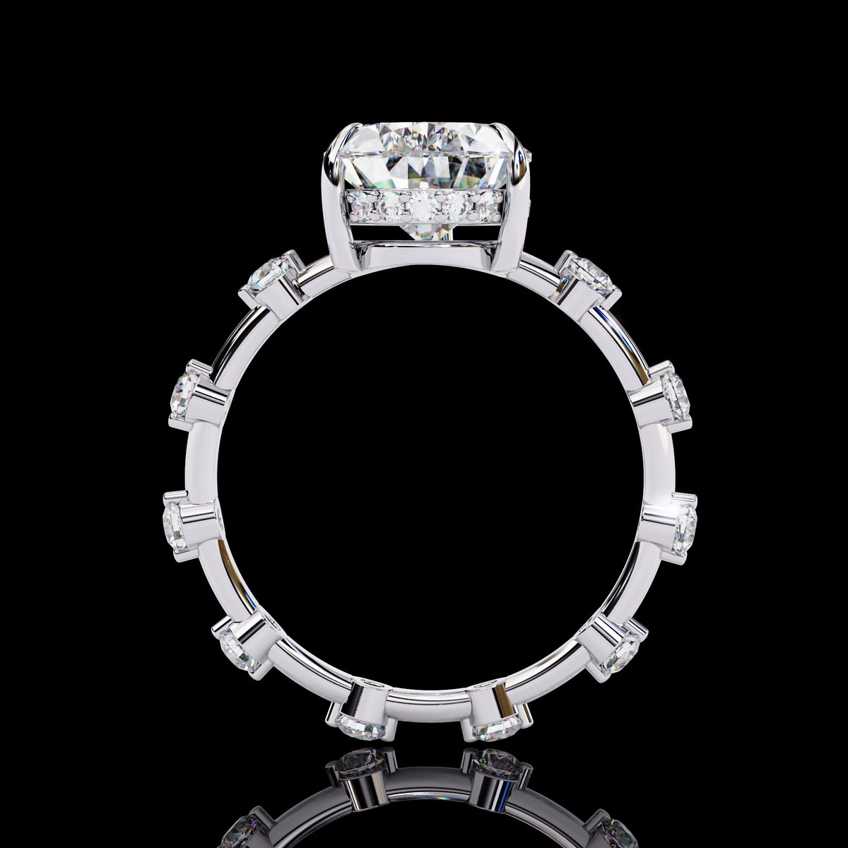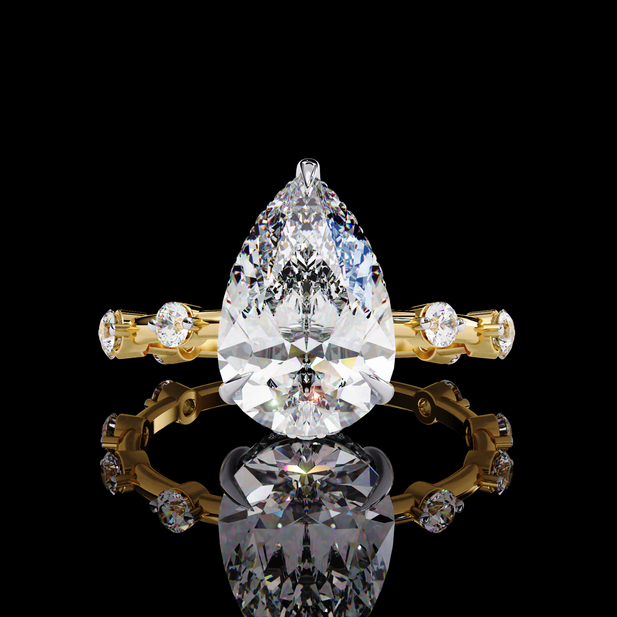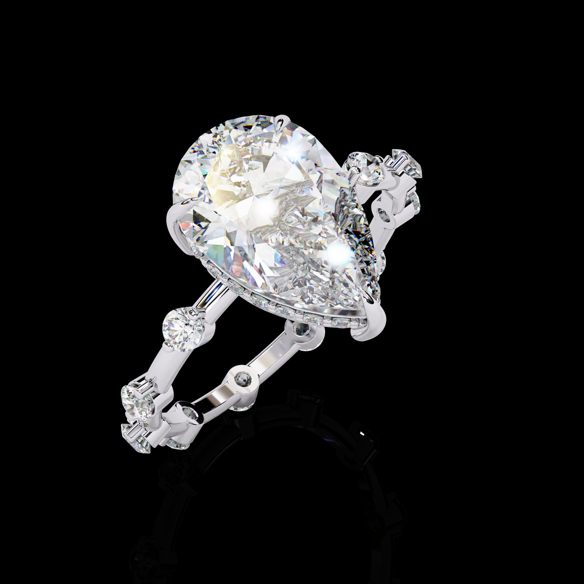 This ring features a striking 3 carat pear-shaped diamond that blends elegance with a bold, refined presence. The tapered silhouette creates a soft, elongated look, while the solitaire setting keeps the design clean and modern. Its facets catch light beautifully, giving the stone a bright, fluid sparkle with every movement.