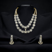 Make a grand entrance with this breathtaking layered Polki-style necklace set. Expertly crafted to capture the essence of traditional Indian royal jewelry, this set features a striking two-tiered cascading design. The brilliantly clear, flat stones emulate the classic elegance of uncut diamonds (Polki). Each stone is beautifully framed by an intricate dark metallic setting that creates a striking contrast against the gold-tone framework, ensuring maximum sparkle. Accompanied by matching statement drop earrings, this set is the perfect crowning jewel for weddings, galas, and grand festive occasions.